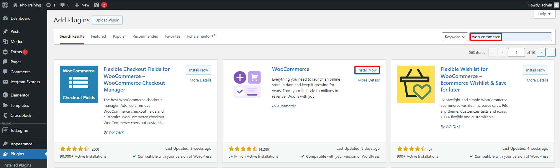 3. Search for “WooCommerce” in the search bar.