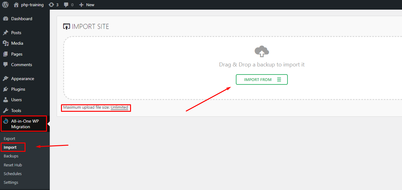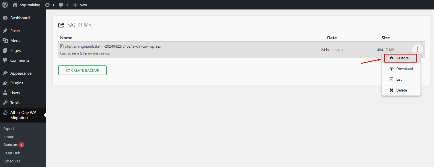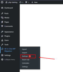 - Step 6: Now navigate to backend of localhost php training site. Your backup plugin had a backup now which you added in the wp-content folder.