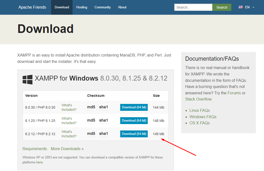 Head over to the official XAMPP website: https://www.apachefriends.org/download.html. Download the version compatible with your Windows system.