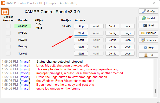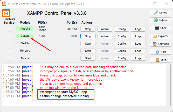 • Look for the “Actions” column for modules like Apache (web server) and MySQL (database).