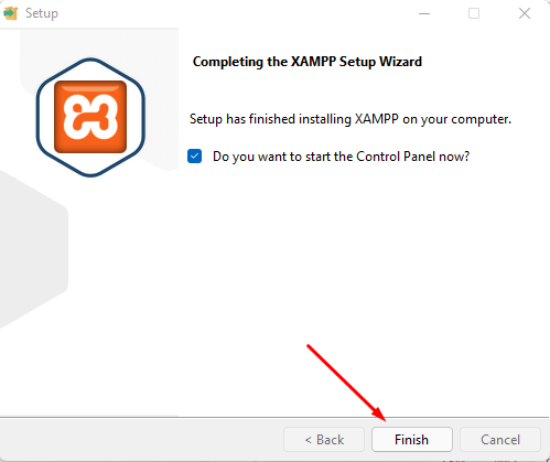 Once the installation is complete, click “Finish” to close the setup wizard. You can optionally choose to launch the XAMPP Control Panel by checking the corresponding box. This control panel allows you to manage your XAMPP server.