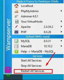 - Right-click the WAMP server icon in your system tray and choose “Restart All Services”.